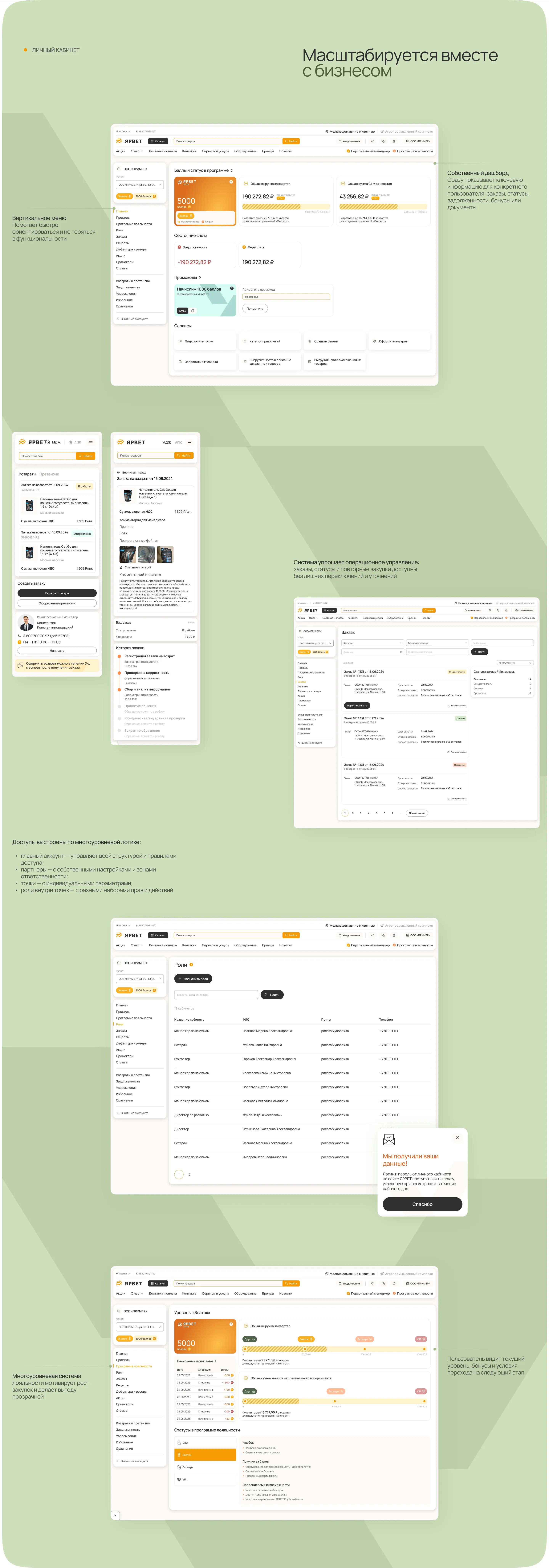 We designed the online store and the personal account as a single system, where the storefront and the administrative tools are linked by a common logic. Due to the multi-level access model, a single screen now has several states: for unregistered users, customers with personalized terms, and different roles within the personal account.