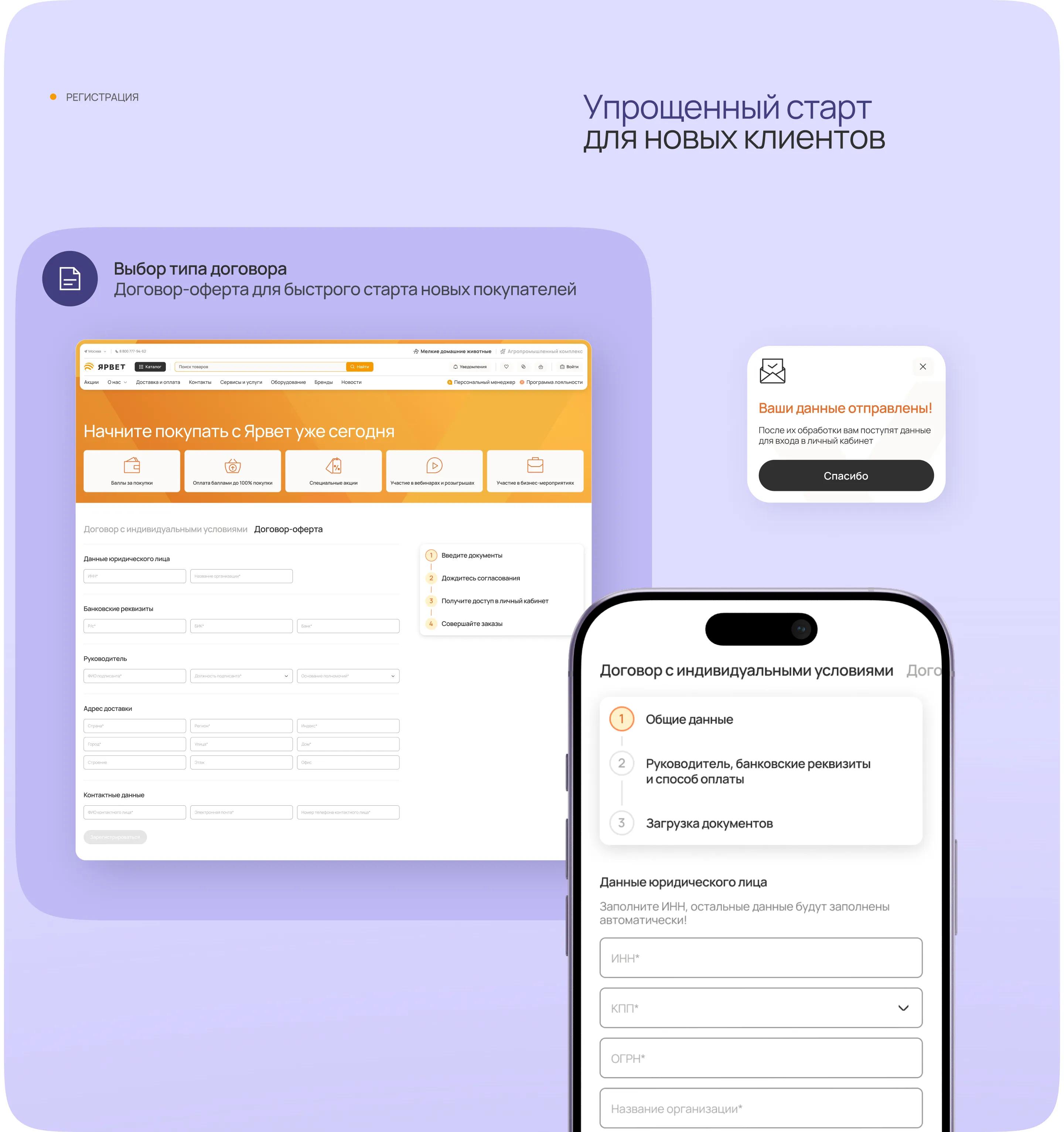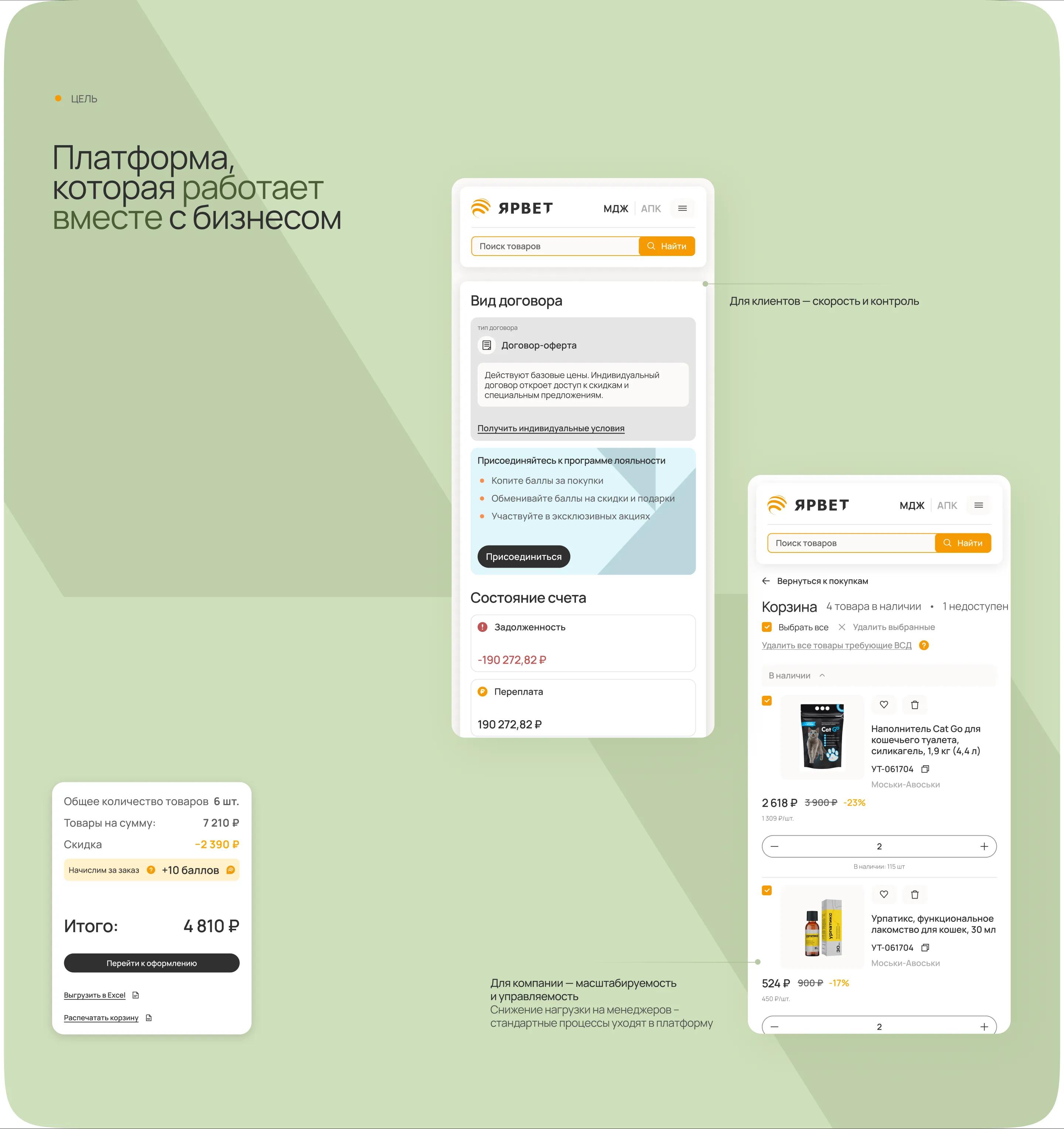 We created a user-friendly digital platform for B2B purchasing and business process management called “Yarvet.” The storefront handles search and order placement, while the personal account manages documents, bonuses, and roles within the company. Everything is connected by a common logic and supports real-world workflows. Together with the client’s team, our analysts worked out all roles and scenarios in detail to ensure that every feature is intuitive and effective.