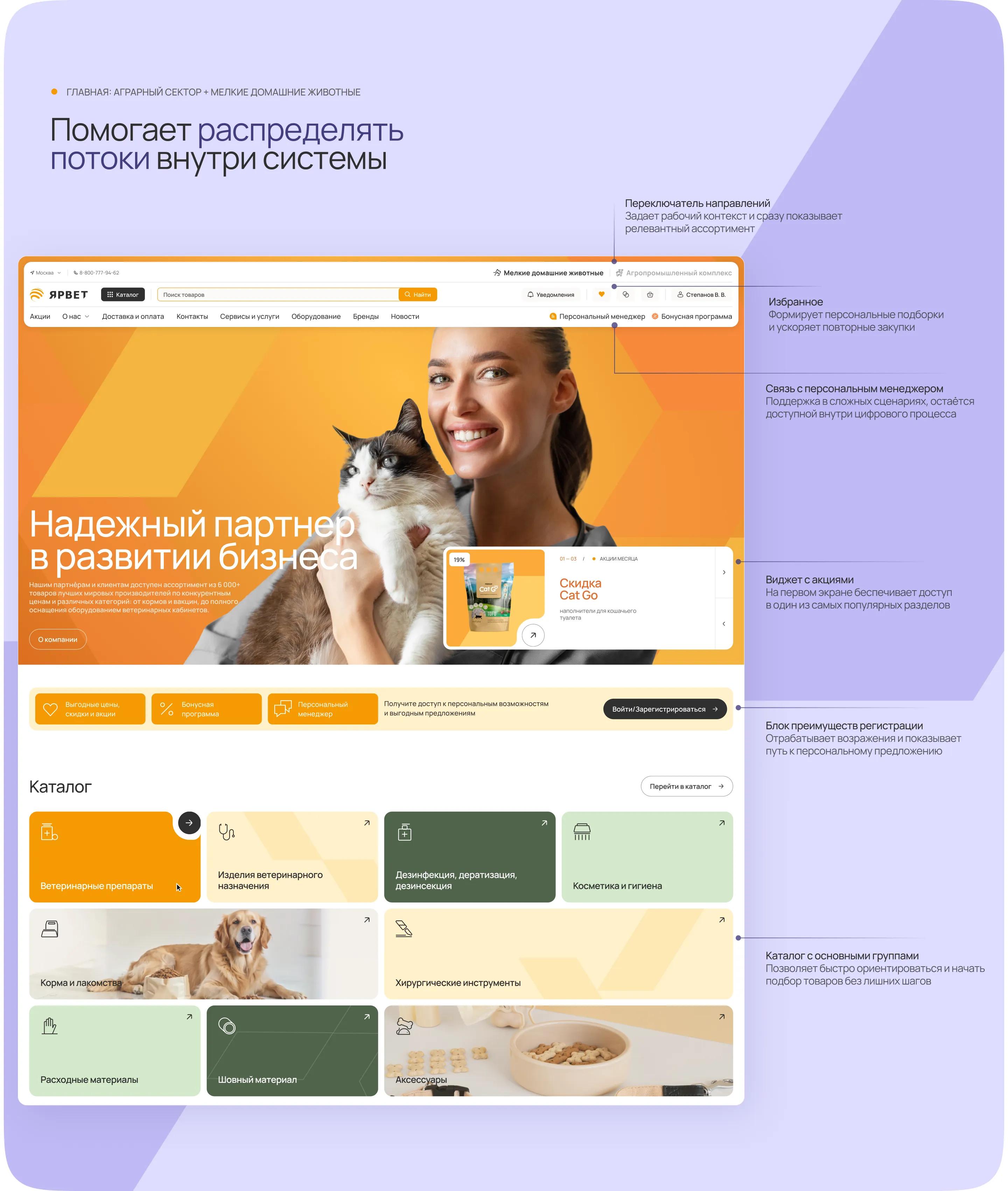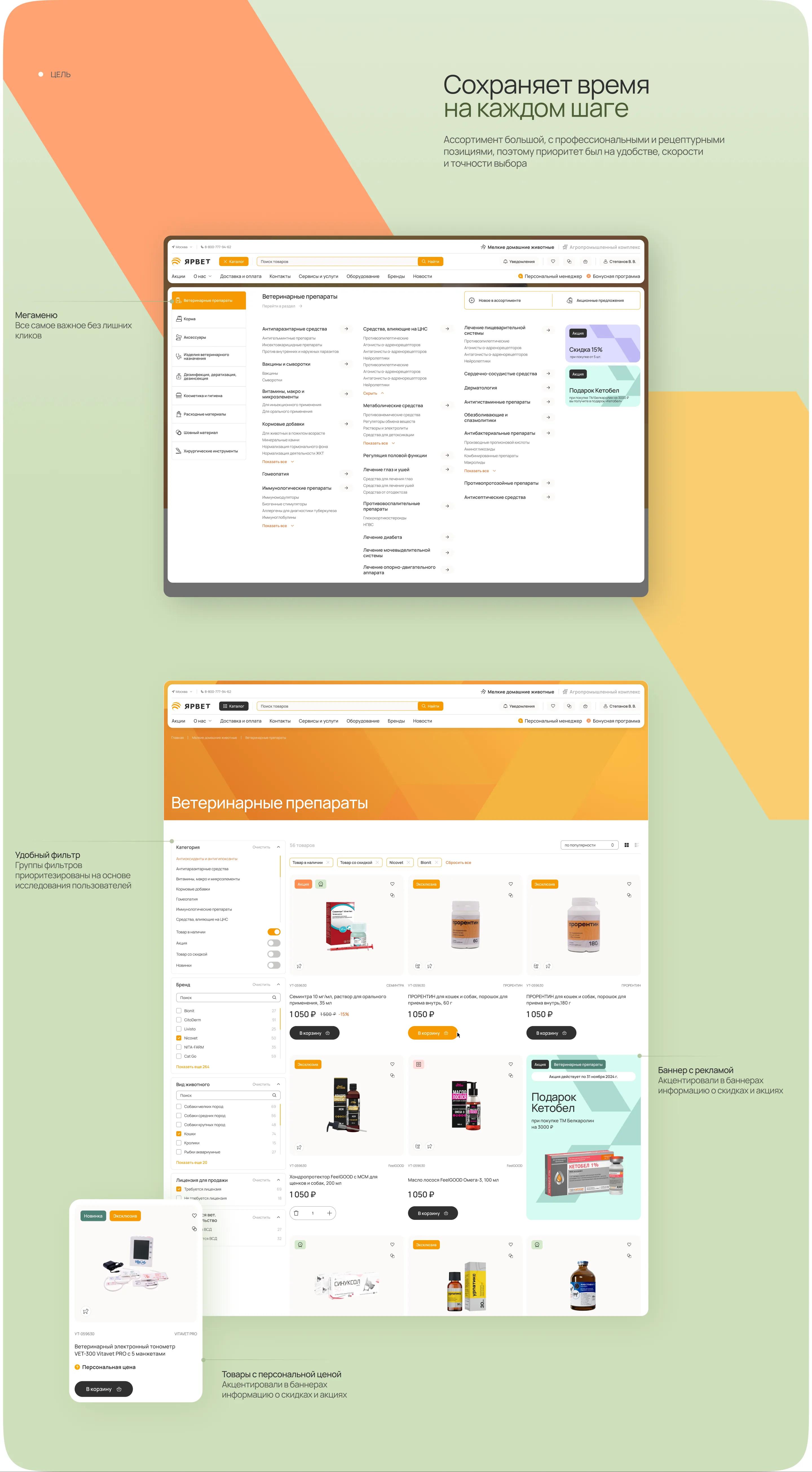 It features a clear category hierarchy, a well-designed mega menu and filters, and search options by product name and active ingredient. The structure allows users to quickly assemble an order, even with a large number of items. Without opening a product card, users can see key information—such as which animals the product is intended for and whether special documentation or a prescription is required—to save time and immediately understand what is available for order.