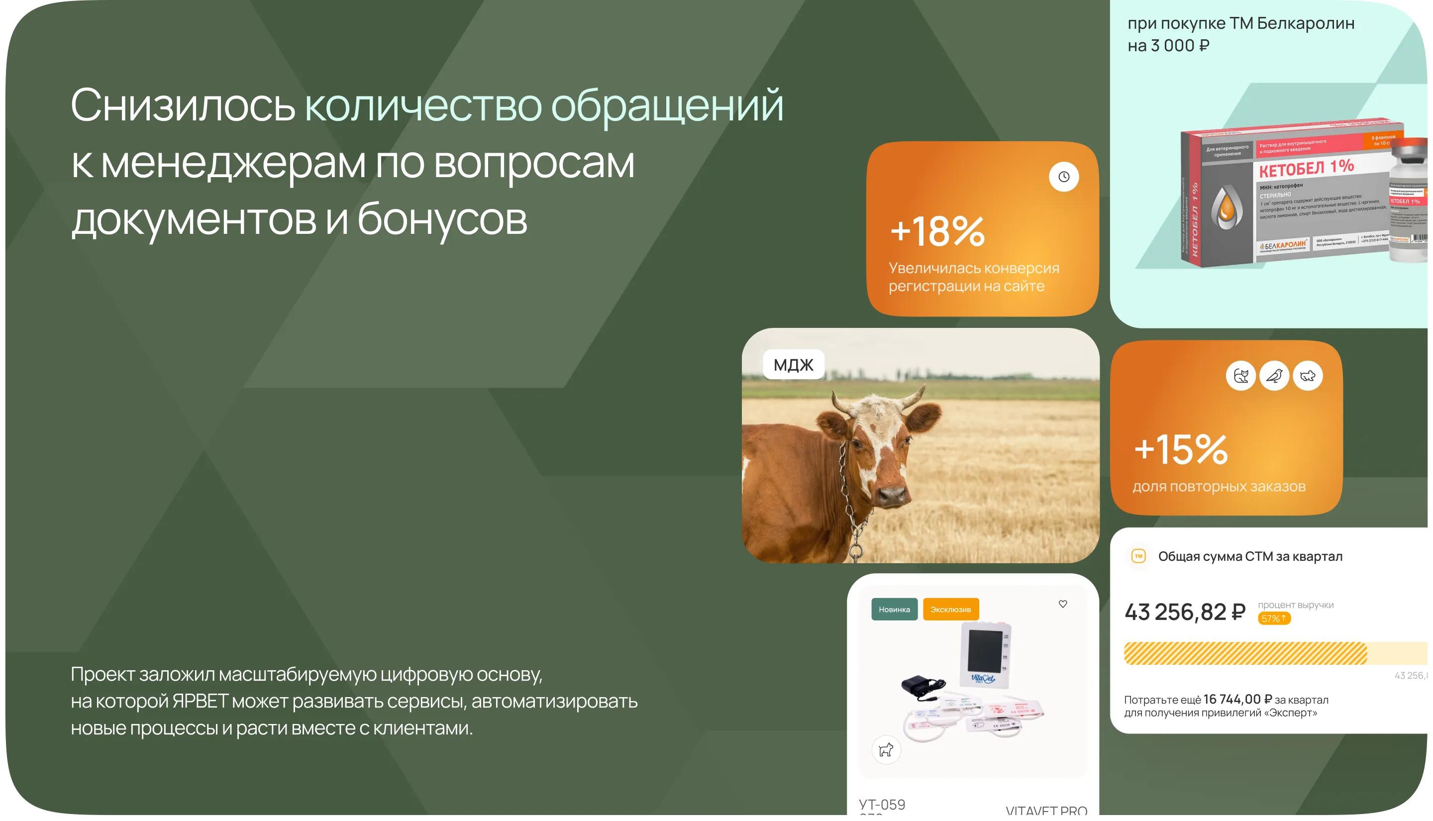 The personal dashboard has become the core of the entire platform. It brings together orders, documents, bonuses, personalized terms, and business structure management. It is not merely an add-on to the online store, but a working environment designed to handle the complex structure of YARVET’s client base.