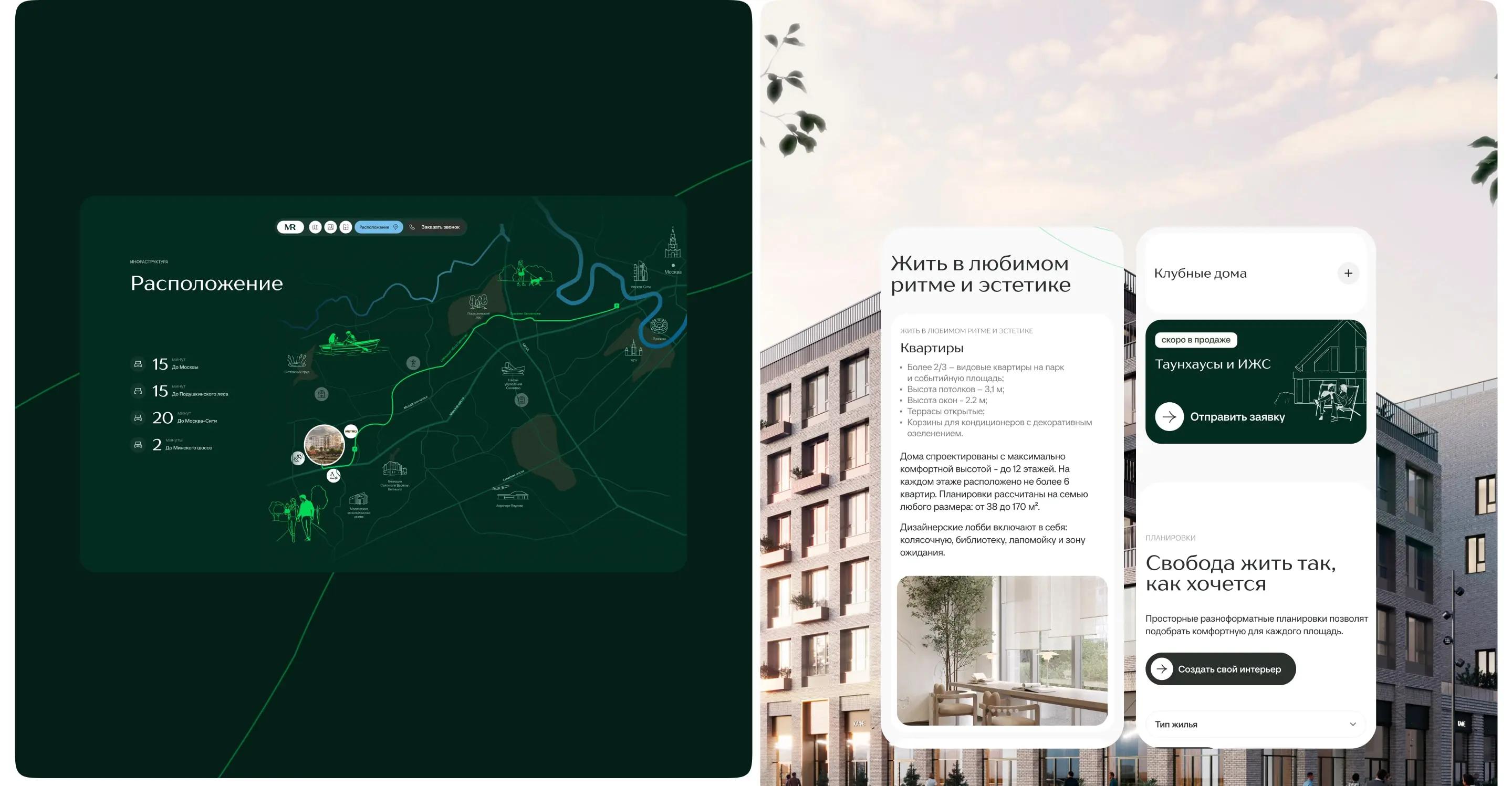 Разработка и UX/UI-дизайн сайта с крафтовыми иллюстрациями для современного жилого кластера