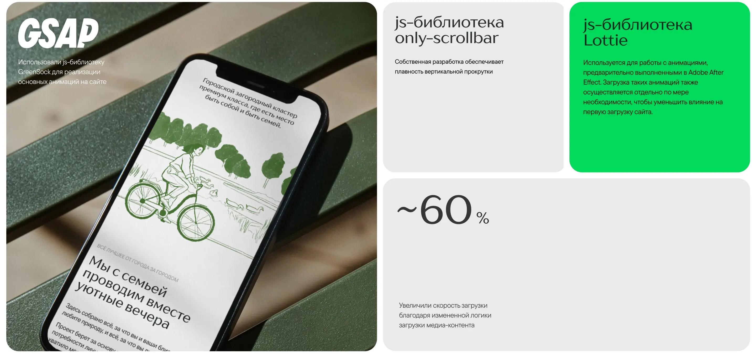 Мы сосредоточились на создании технологичной основы, которая остаётся незаметной для пользователя. В первую очередь, обеспечили быструю загрузку страниц и плавность всех анимаций, чтобы ничто не отвлекало от знакомства с комплексом. Для удобства пользователей реализовали интеграцию с CRM-системой клиента. Теперь данные по доступным квартирам в выборщике всегда актуальны, а процесс выбора стал максимально прозрачным.