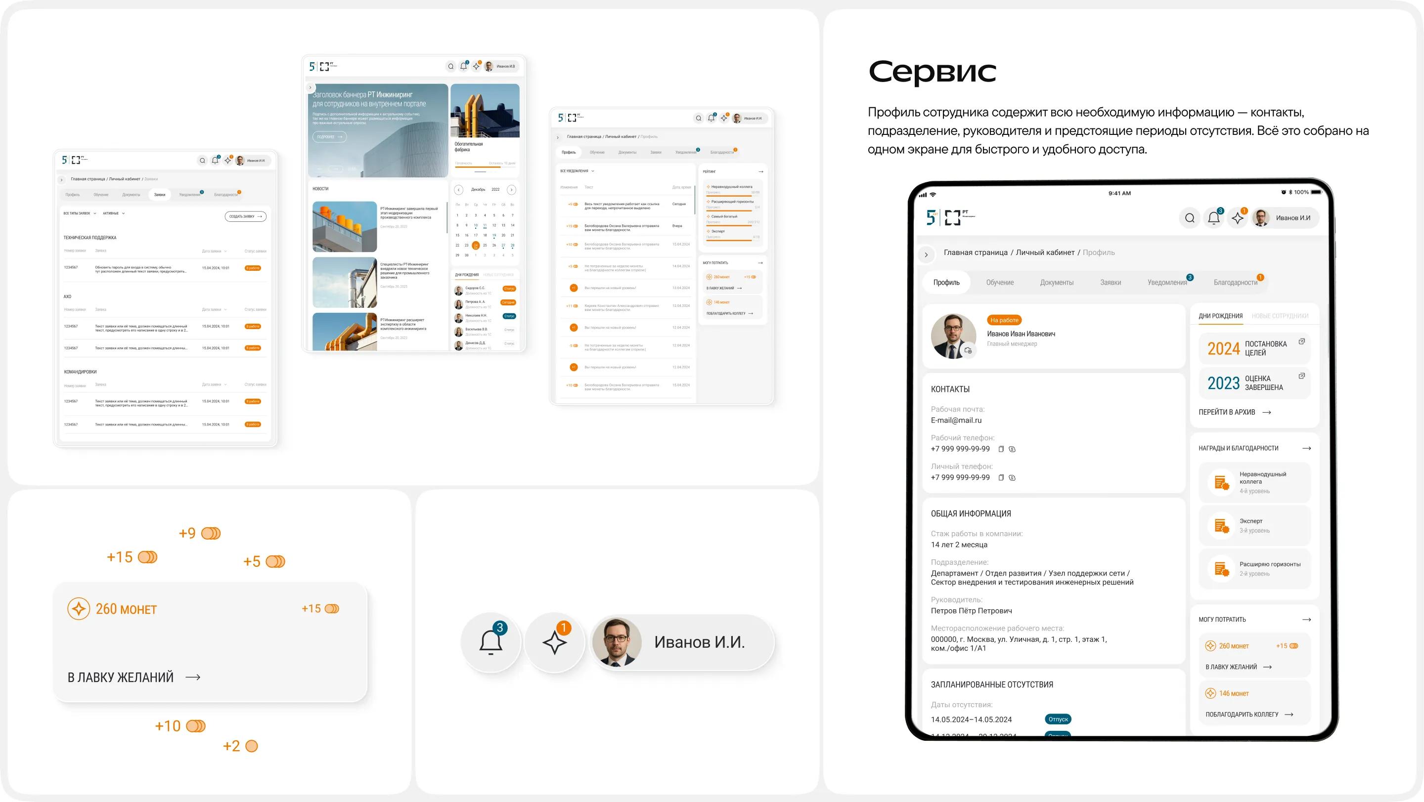Обновлённый портал поддерживает повседневные задачи, коммуникации и систему поощрений. Личный кабинет адаптируется под роль пользователя: сотрудники получают доступ к личным данным и документам, а руководители — к инструментам управления, согласования и внешним системам. Система рейтингов прозрачно отражает активность и достижения сотрудников.