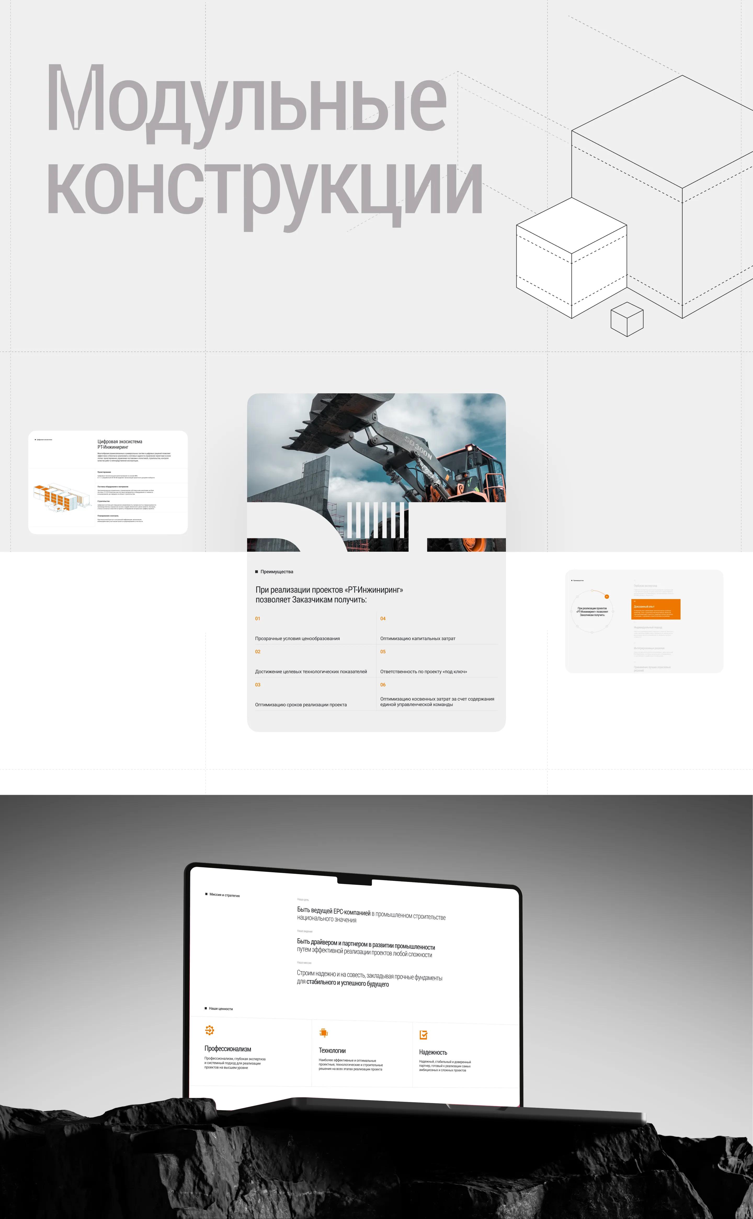 Визуальная система сайта строится вокруг чётких линий, каркасных форм и модульных конструкций — через графику мы передали инженерный характер деятельности PT-Инжиниринг.