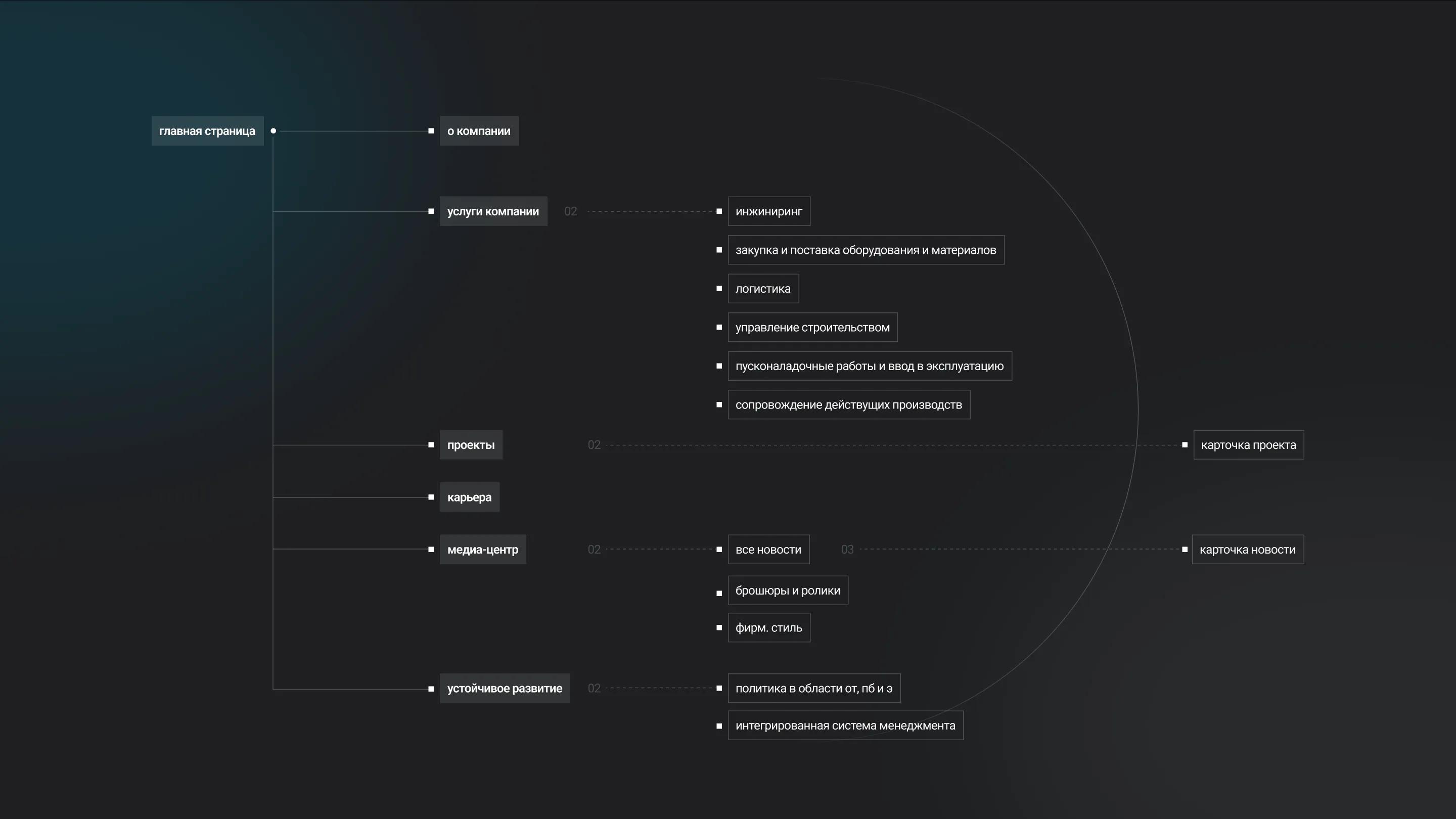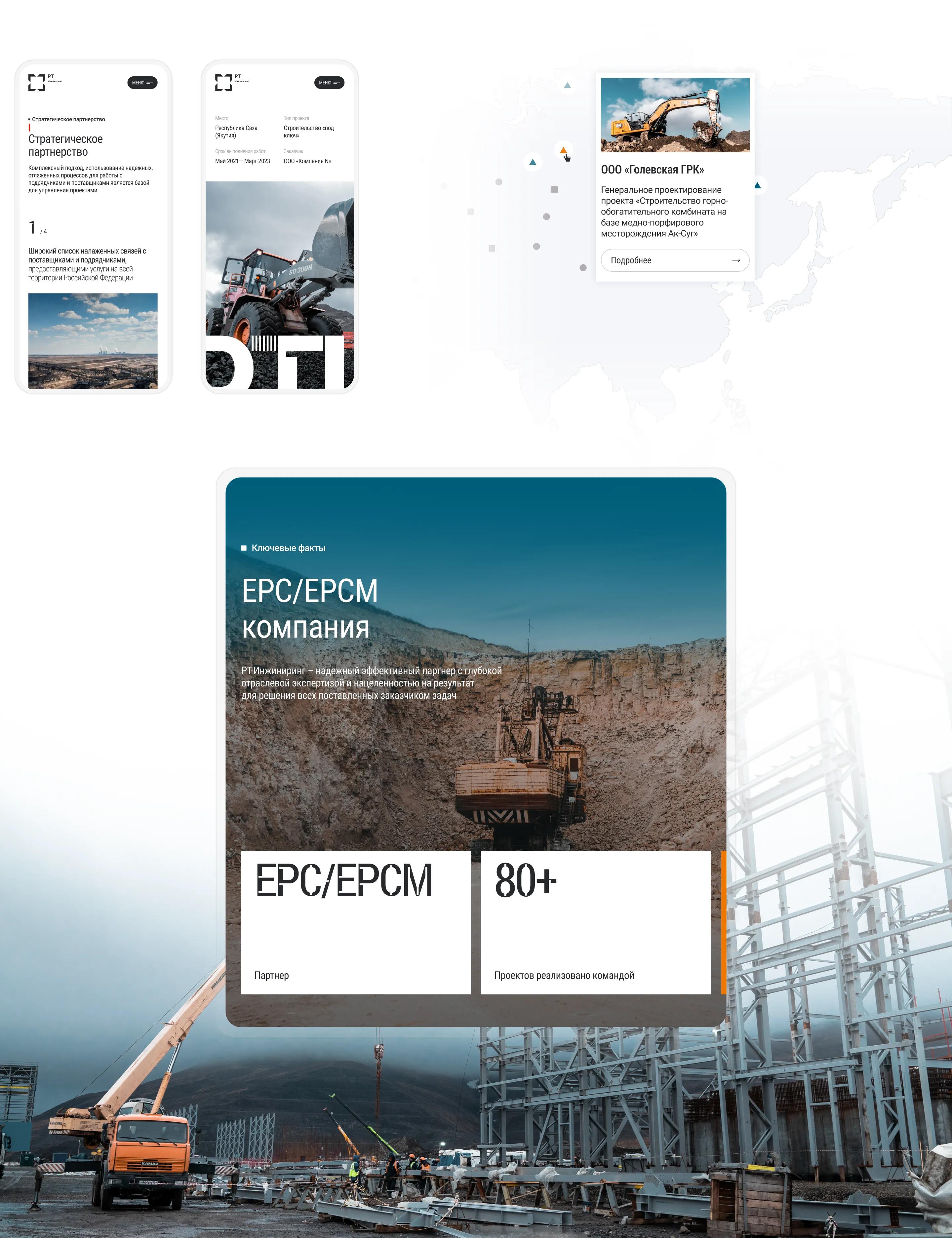 Мы сделали акцент на масштабе и последовательности: проект развивается по шагам, каждый из которых визуализирован в понятной, логичной схеме. Так пользователь сразу погружается в суть деятельности предприятия — крупные инженерные решения, доведенные до результата.