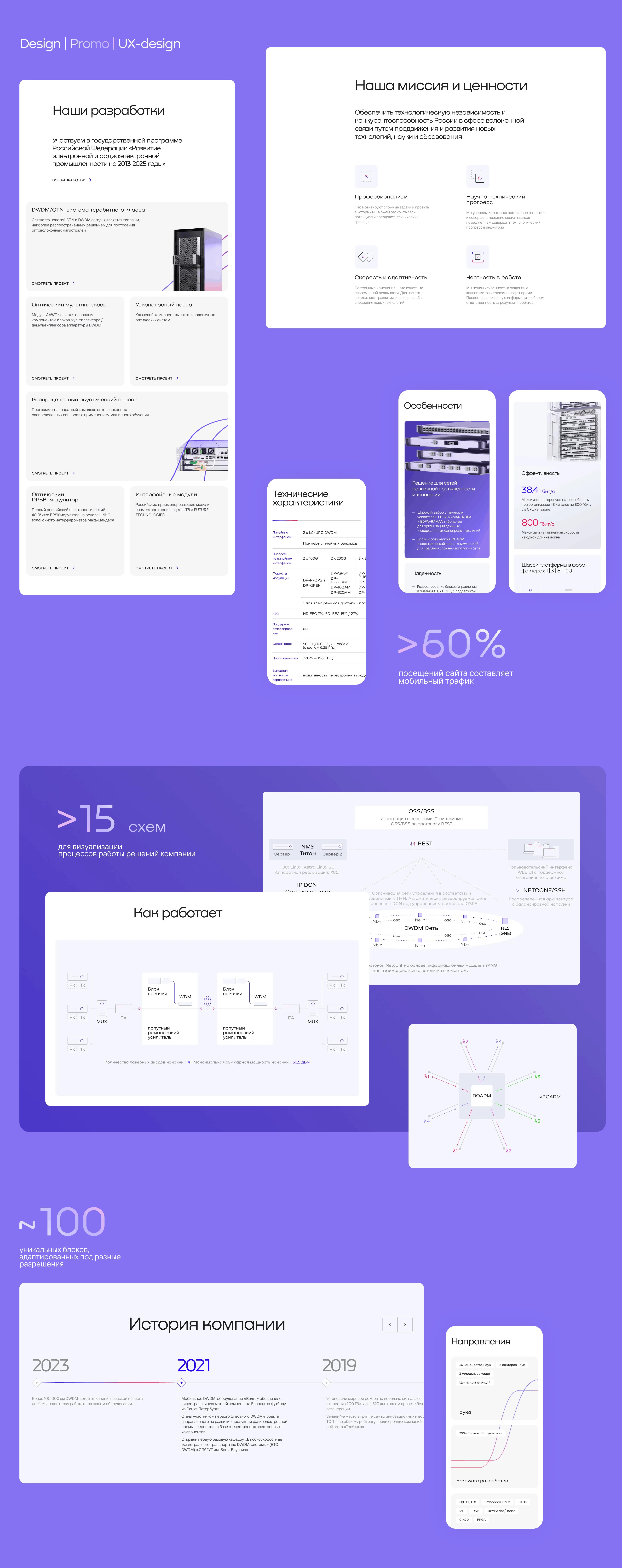 Цветовое решение подчинено контексту: корпоративные страницы — светлые с акцентом на типографику, промо-лендинги — с градиентами, подчёркивающими технический и маркетинговый характер продукта.