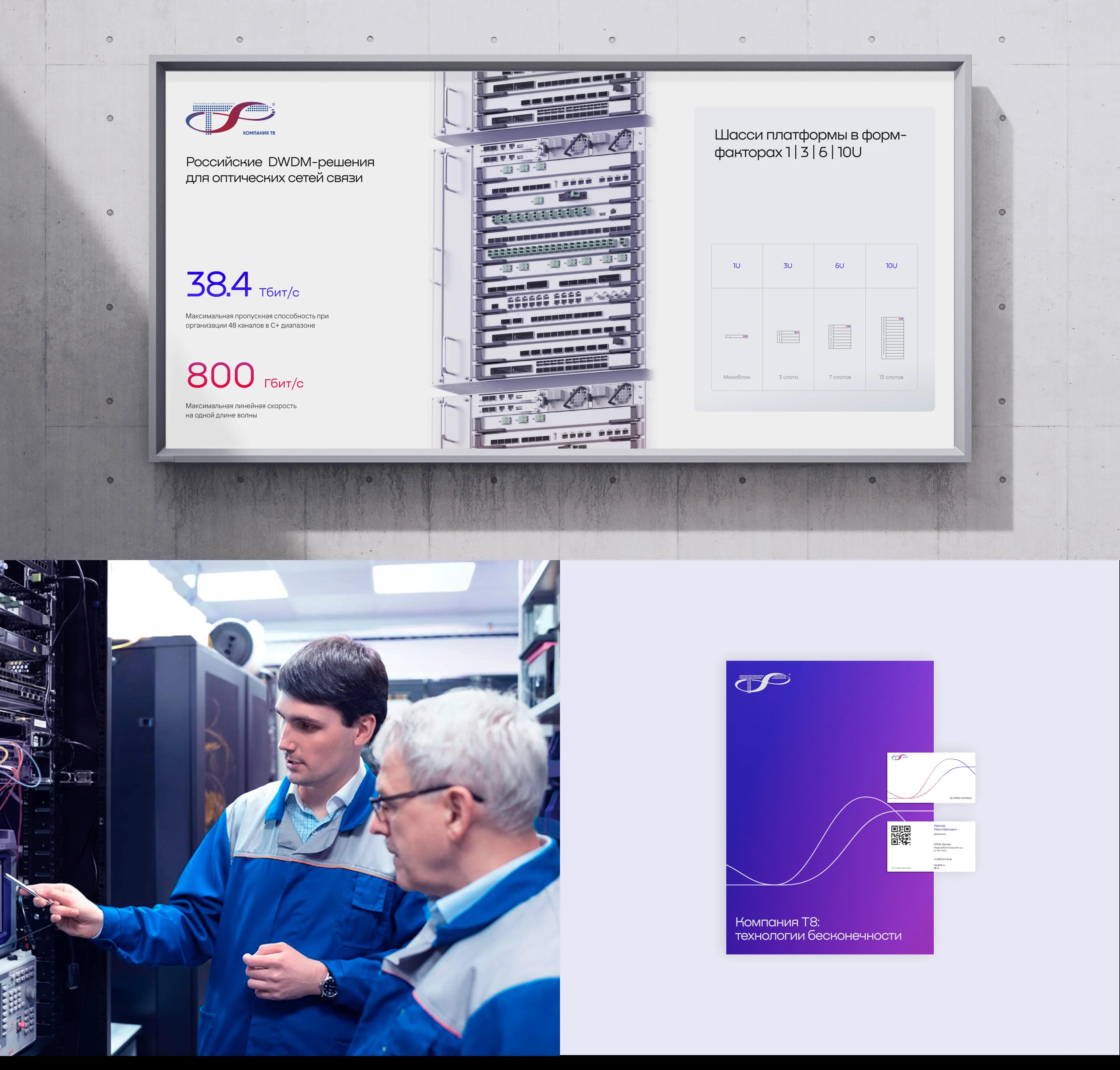 Фирменный стиль T8 основан на метафоре «сердца связи»: линейная графика отражает структуру оптических сетей и инженерных чертежей, формируя узнаваемый визуальный ритм. Цветовая палитра сочетает синий и красный с градиентным переходом, где красный используется как акцент и подчёркивает технологичность бренда.
