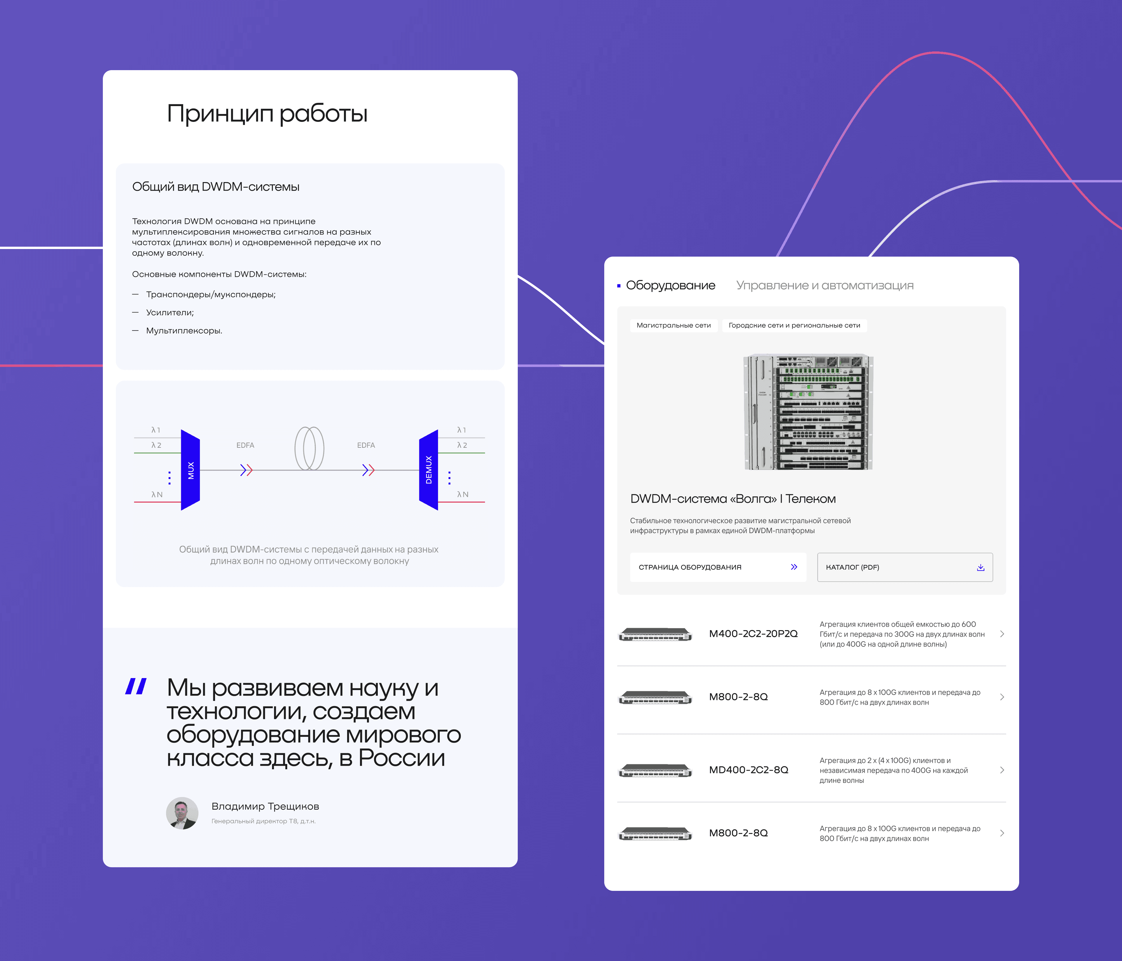 Каталог объединяет оборудование и программное обеспечение с кросс-ссылками между карточками: например, пользователь может открыть страницу DWDM-системы «ВОЛГА», изучить характеристики оборудования и перейти к соответствующему ПО «Система управления NMS Титан» и обратно. Так пользователи могут разными путями понять взаимосвязь оборудования и ПО — информация доступна на каждом уровне каталога.