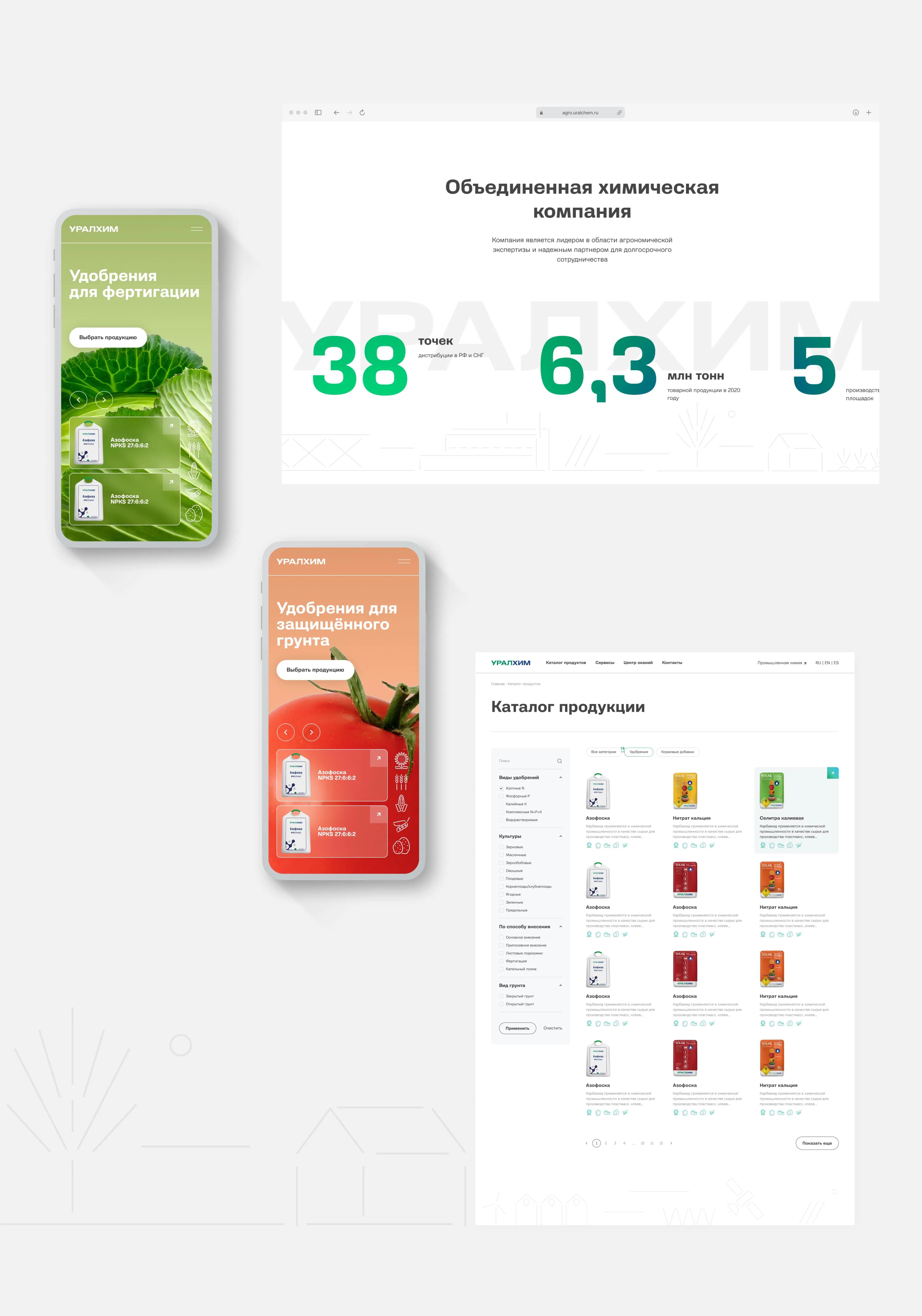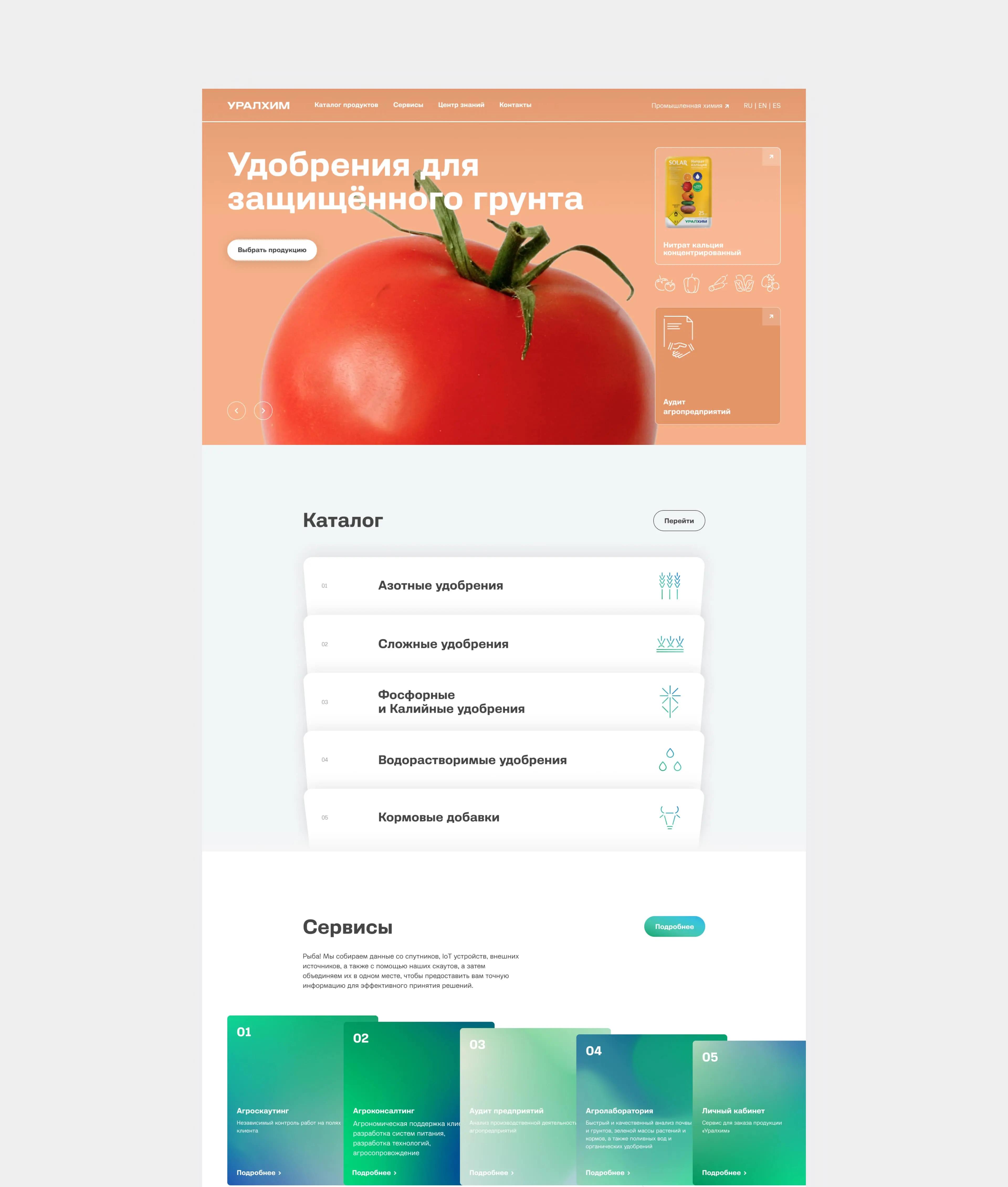 Основная задача сайта — привлечение новых потребителей и продажа продукции компании. Помимо высокоэффективных видов удобрений, Уралхим предлагает комплексные решения для аграрного бизнеса, основанные на обширном опыте в сельском хозяйстве и развитии цифровизации. Для того чтобы в полной мере отразить ценностное предложение компании, важно было структурировано подать информацию и сделать сайт визуально приятным и удобным для использования.
