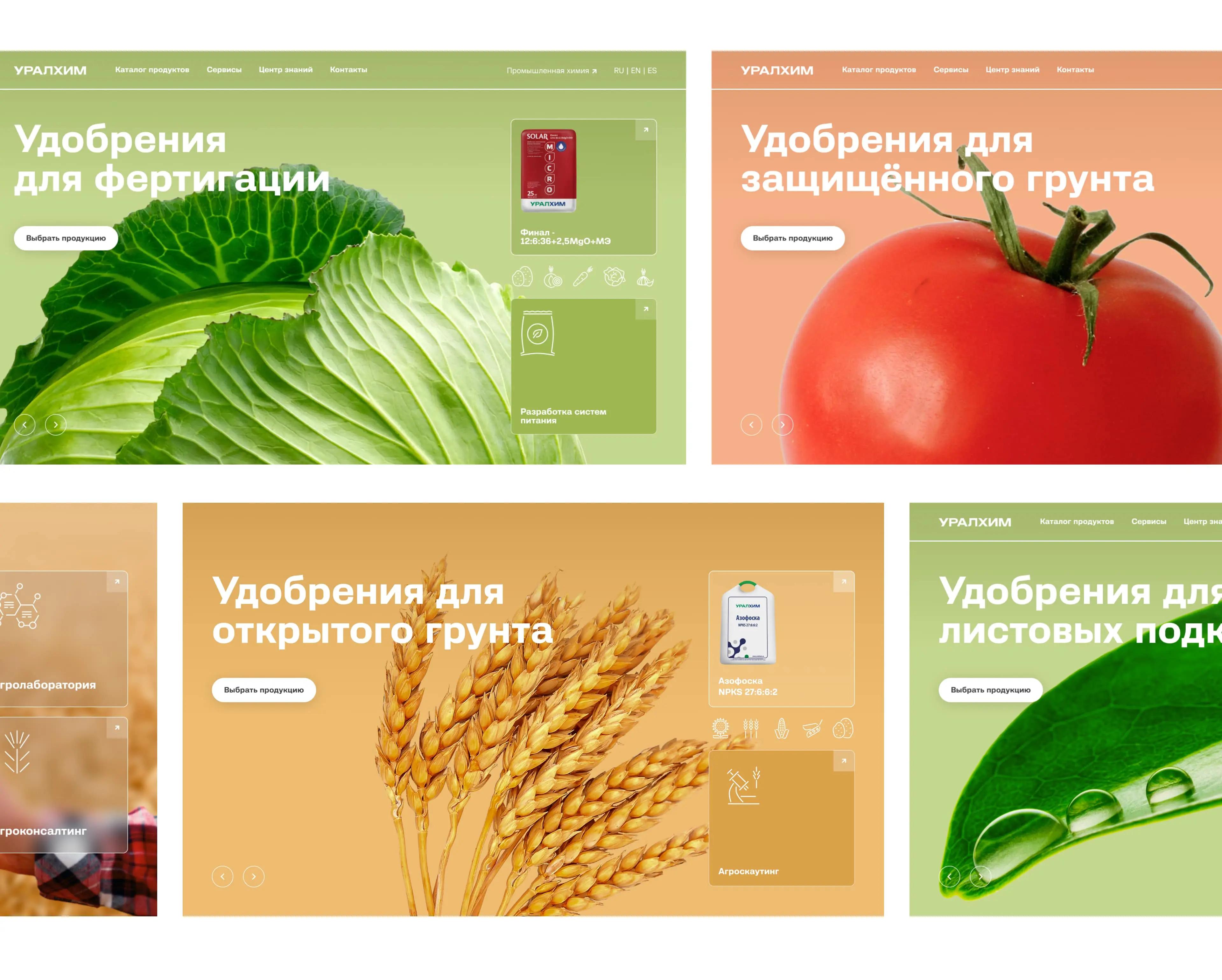 Стабильность и инновационность бренда мы отразили за счет контрастов в визуальном языке. С одной стороны, он сдержан и лаконичен — в нем нет излишеств, которые могли бы отвлечь пользователя от УТП компании. В продуктовых же элементах заметна некая игривость, выраженная в сочных оттенках желтого, зеленого и красного. Яркие фотографии с/х культур на главной странице создают понятные ассоциации для основных потребителей продукции сайта — крупных аграрных компаний и частных фермеров.