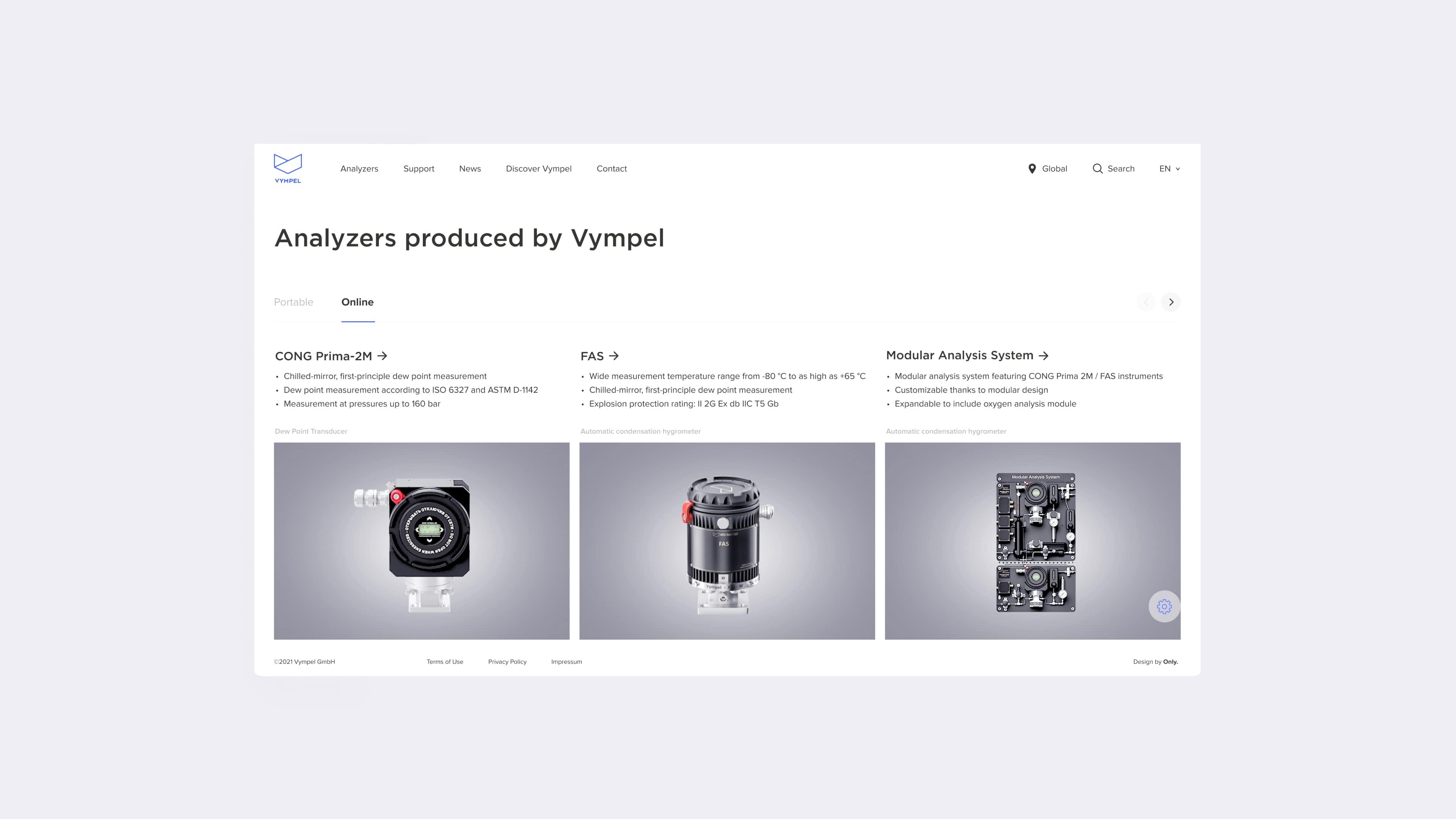 В основе дизайн-концепции лежит детальная визуализации оборудования, которое производит компания. Мы разработали 3D-модели каждого из анализаторов и сделали вовлекающую анимацию на главной странице. Сайт учитывает все варианты пользовательского пути — заказать продукцию Вымпел можно как на главной странице, так и в соответствующем разделе. Более того, представлена возможность детального сравнения характеристик оборудования.