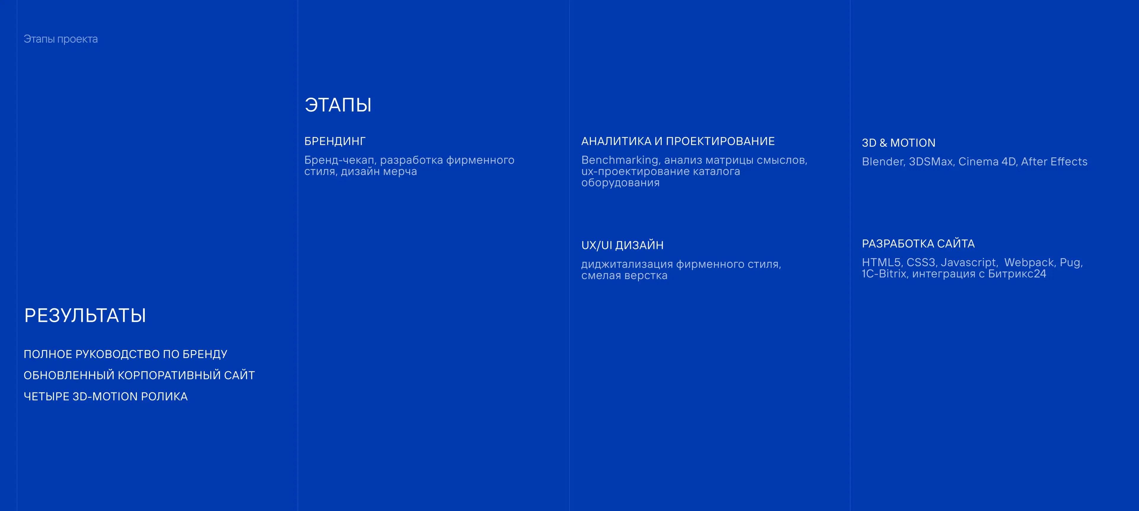 Проанализировав конкурентов по системе матрицы смыслов, мы поняли, что точки роста в сфере нашего клиента — современность и понятность. Современность мы решили отражать через фирменный стиль и дизайн сайта, а понятность — через интуитивно понятную структуру сайта и чёткие смысловые блоки на страницах.